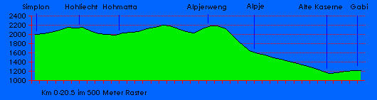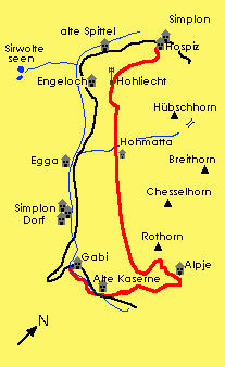 Kurzbeschreibung: Der beschilderte Wanderweg beginnt beim Simplon-Hospiz. Er steigt zu Beginn leicht an bis zum Sendeturm im Hohliecht. Danach geht's leicht bergab in die Hohmatte und steigt erneut an bis auf 2200 m in die sogenannte Alpjerbibi. Jetzt beginnt die Traverse durch die Alpjerweng und danach der sehr steile Abstieg auf die Alpjen. Für dieses Teilstück ist Schwindelfreiheit und Trittsicherheit unerlässlich. Von den Alpjen zur «Alten Kaserne» führt eine gut ausgebaute Strasse. Das letzte Stück bis zur Postauto-Station im Gabi kann auf dem Stockalperweg absolviert werden. . |