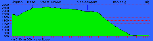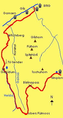 Kurzbeschreibung: Bis auf den Gebidempass führt die Wanderung über sehr gut unterhaltene und beschilderte Wanderwege. Auf dem Gebidempass schlägt man den Weg ein der links unter dem TV-Sender durchführt. Nachdem dieser Weg ca. 2.5 km beinahe flach verläuft, fällt er ziemlich steil ab bis auf den Rohrberg. Dort wandert man auf der Flurstrasse bis nach Gamsen und weiter zum Ziel in Brig. Die Wanderung weist zwar keine allzugrosse Steigung auf, ist aber relativ lang und endet mit einem Abstieg von 1800 Höhenmetern. Eine gute Kondition ist somit Voraussetzung um diese Tour geniessen zu können. .. |
