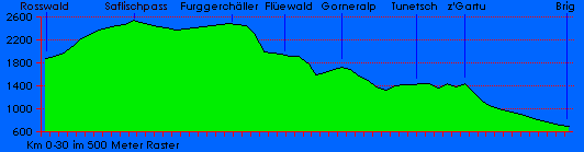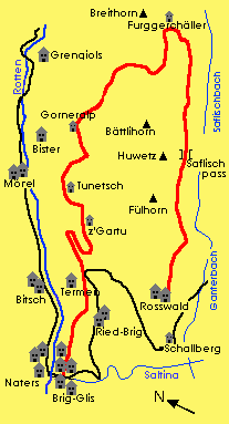 Kurzbeschreibung: Den Rosswald erreicht man mit dem Auto oder mit der Gondelbahn ab Ried-Brig. Auf dem beschilderten Wanderweg marschiert man über den Fletschbode und über den Saflischpass bis in die Tanzbede. Um bis in in den Furggerchäller nicht an Höhe zu verlieren kann man den Weg verlassen und linksseitig die grasbewachsene Bergflanke traversieren. Ansonsten steigt man auf dem Weg ca. 120 Höhenmeter ab bis auf die Flurstrasse Richtung Furggerchäller. Auf dem Furggerchäller benutzt man nicht den Weg nach Grengiols. Auf einem kleinen Weg läuft man westwärts Richtung Letihorn. Der Weg führt in einen sehr steil abfallenden Graben und löst sich allmählich in Nichts auf. Jetzt nur keine Panik! Steigt man weiter durch den Graben ab, trifft man auf eine Wasserfassung und eine gut begehbare Wasserleitung die zum Flüewald führt. Durch den Flüewald, den Bättiggraben, über die Gorneralp und durch den Gifrischgrabe ist der Weg nicht immer sehr einfach zu finden. Es ist wichtig die Karte zu konsultieren. Ab der Tunetschalp führen wieder gut beschilderte Wege bis nach Brig. Die Wanderung ist sehr lang und streng. Besonders das Wegstück vom Furggerchäller bis auf die Tunetschalp ist anspruchsvoll. Genügend Getränke mitnehmen und auf keinen Fall das Kartenmaterial vergessen. . |